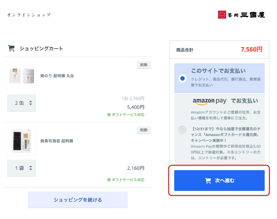 「このサイトで支払い」を選択して「次へ進む」のボタンを押下してください。