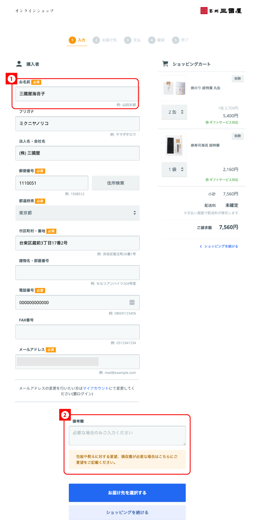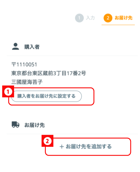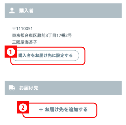 ①の「購入者をお届け先に設定する」ボタンを押下することで、お届け先が設定できます。