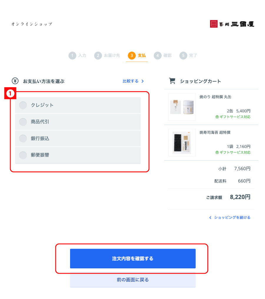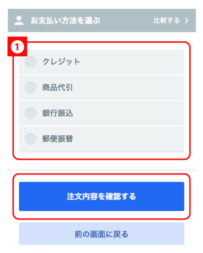 クレジットカード、商品代引、銀行振込、郵便振替の場合、お届け先の設定まで終わりましたら、お支払い方法の選択画面になりますので、お支払方法を選ぶ(①)よりご希望のお支払方法をご選択ください。