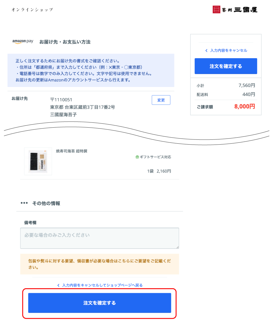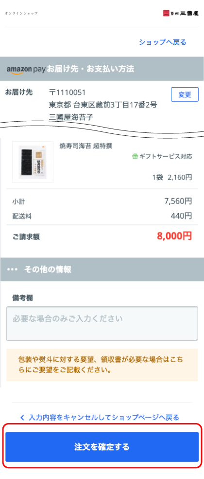 amazon payにログイン後、お届け先住所、支払い情報ご注文内容などの確認を行い、問題なければ「注文を確定する」ボタンを押下してください。